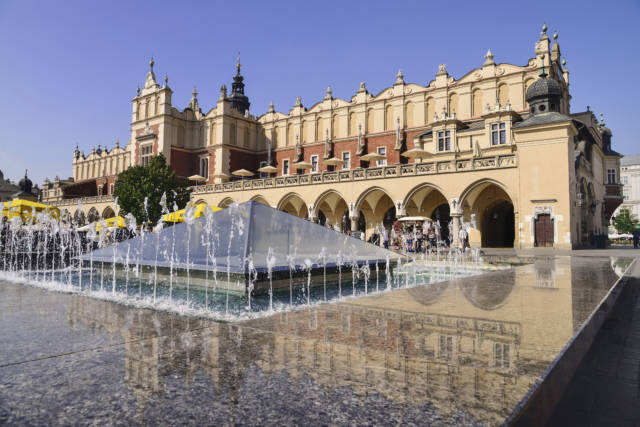 Poland, Krakow, Rynek Glowny or Main Market Square, General view of the square with Sukiennice or The Cloth Hall.