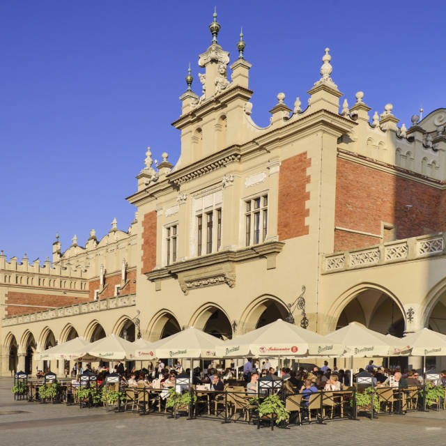 Poland, Krakow, Rynek Glowny or Main Market Square, Evening dining on the west side of the square with Sukiennice or The Cloth Hall.