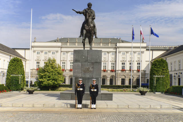 Poland, Warsaw, Poland, Warsaw, Ul Krakowskie Przedmiescie or The Royal Way, Radziwill Palace, Presidential Residence with a statue of Prince Józef Poniatowski and 2 guards in front.