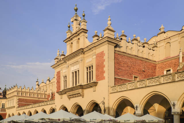 Poland, Krakow, Rynek Glowny or Main Market Square, A section of the facade on the west side of the Sukiennice or The Cloth Hall.
