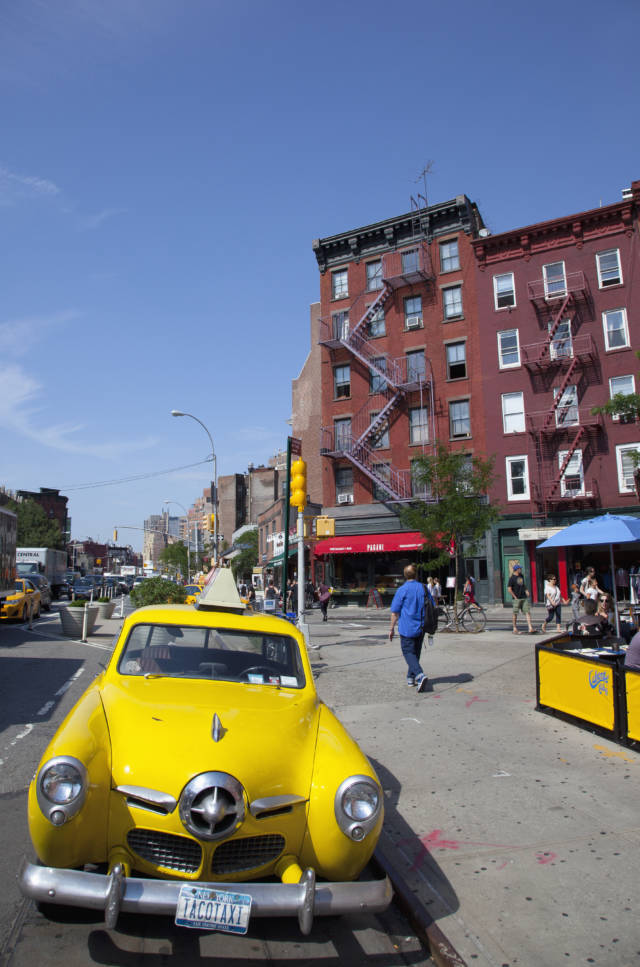 USA, New York State, New York City, Manhattan, Greenwich village, Yellow Studebaker car parked outside the Caliente Cab Co Bar on the corner of Bleecker Street and 7th Avenue.