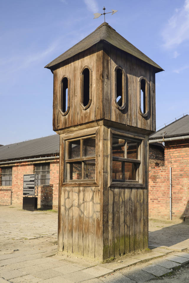 Poland, Auschwitz-Birkenau State Museum, Auschwicz Concentration Camp, Assembly Square with SS guards booth.